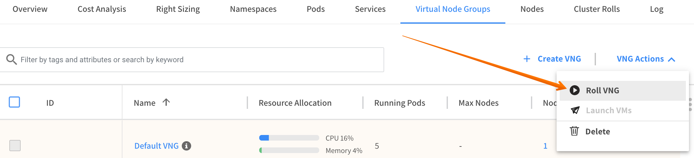 launchSpecIdsparameter initiates a roll of one or more virtual node groups in the cluster. When you specify a virtual node group ID, all the nodes in that virtual node group are rolled.