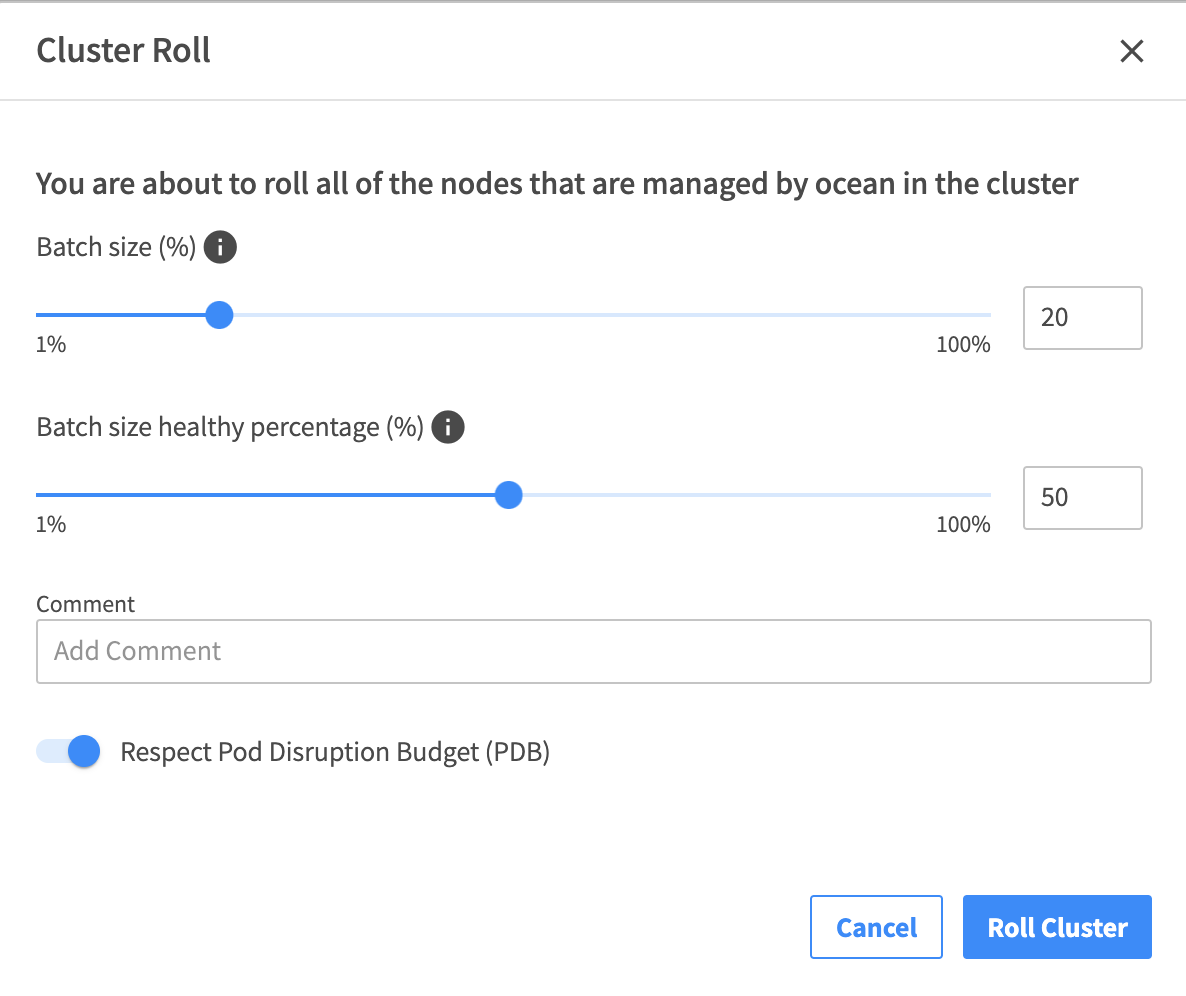 - Batch Size: Indicates how much will be rolled at a time. This value is a percentage of the cluster's target capacity.