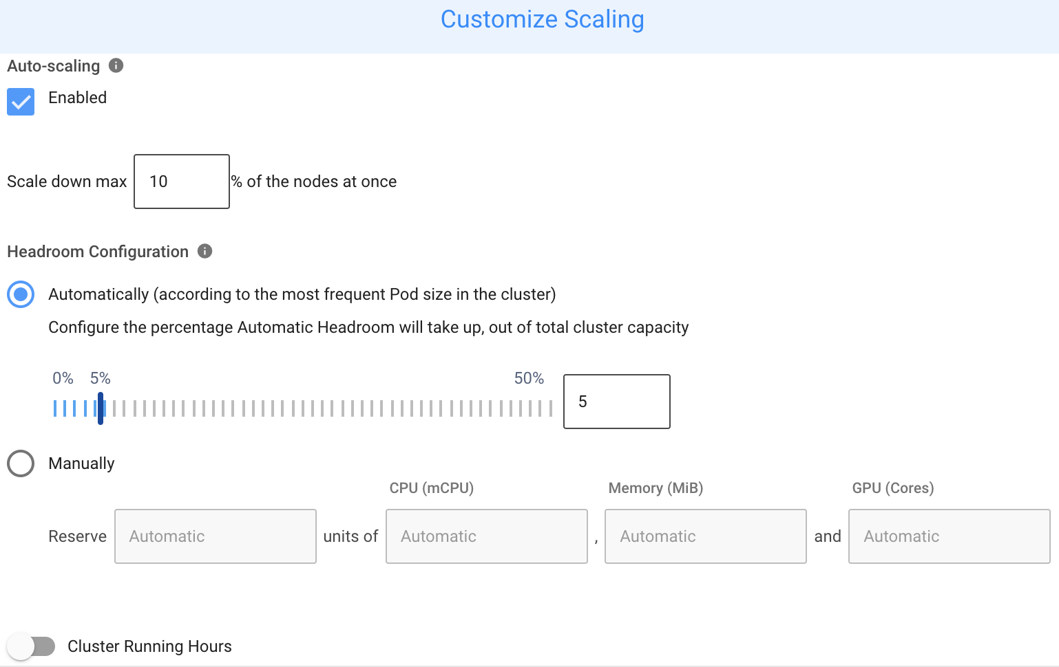 cautionKeep Auto-scaling enabled for normal operation. Turning off Auto-scaling prevents Ocean from scaling up or down, maintaining headroom, or properly restoring the cluster after Cluster Shutdown Hours.